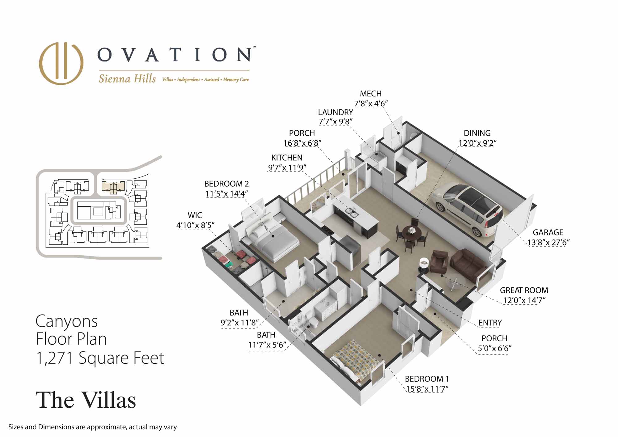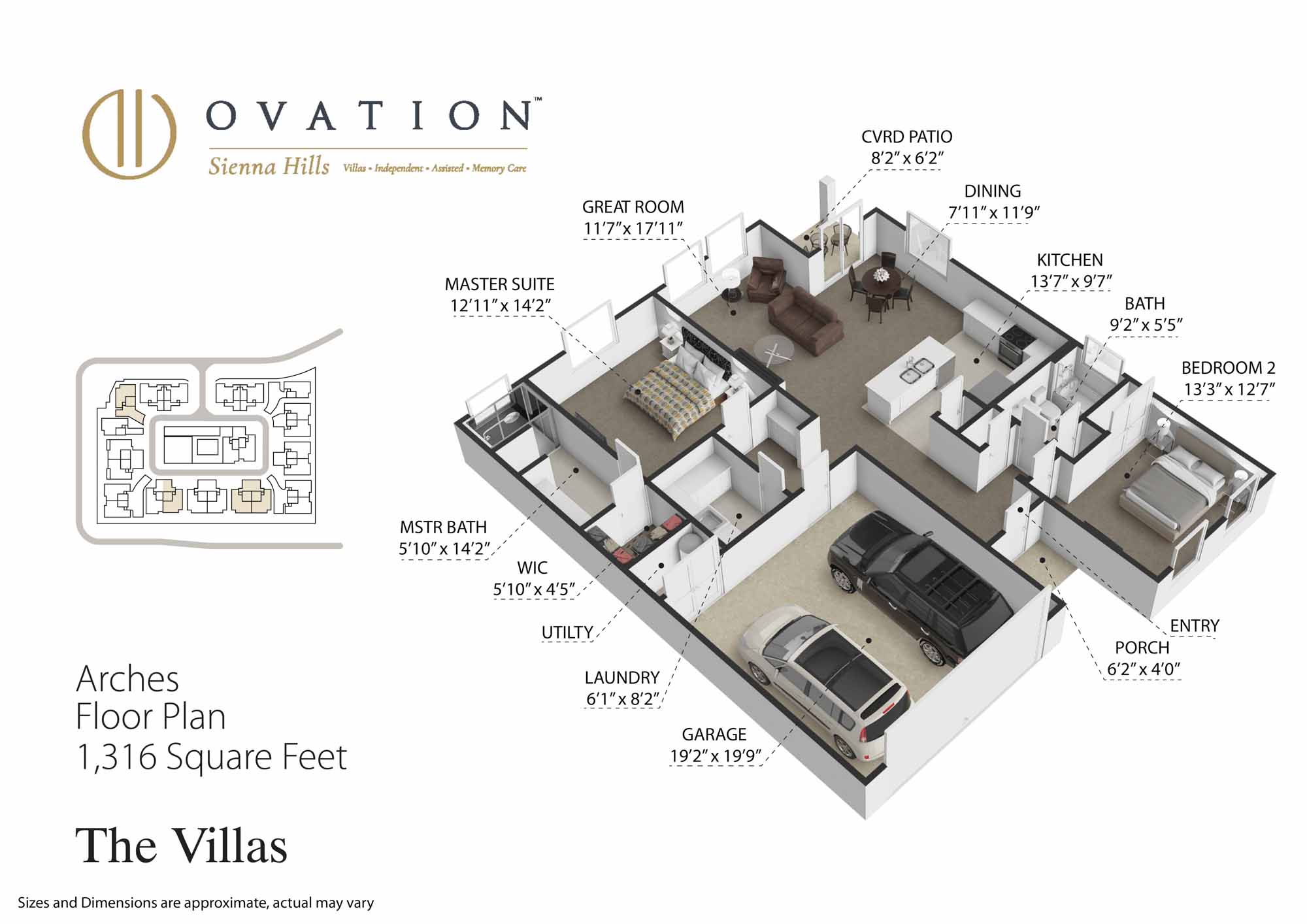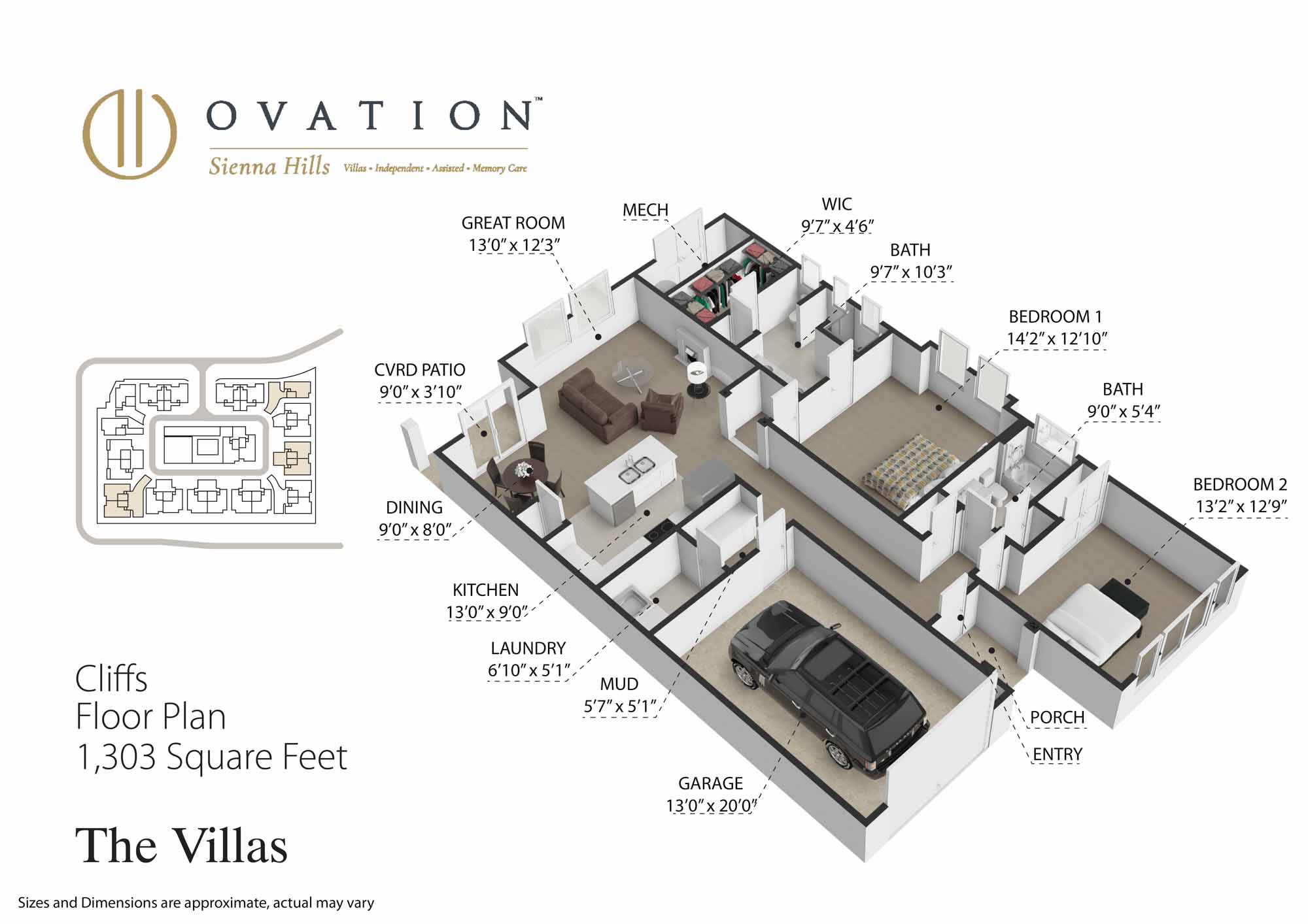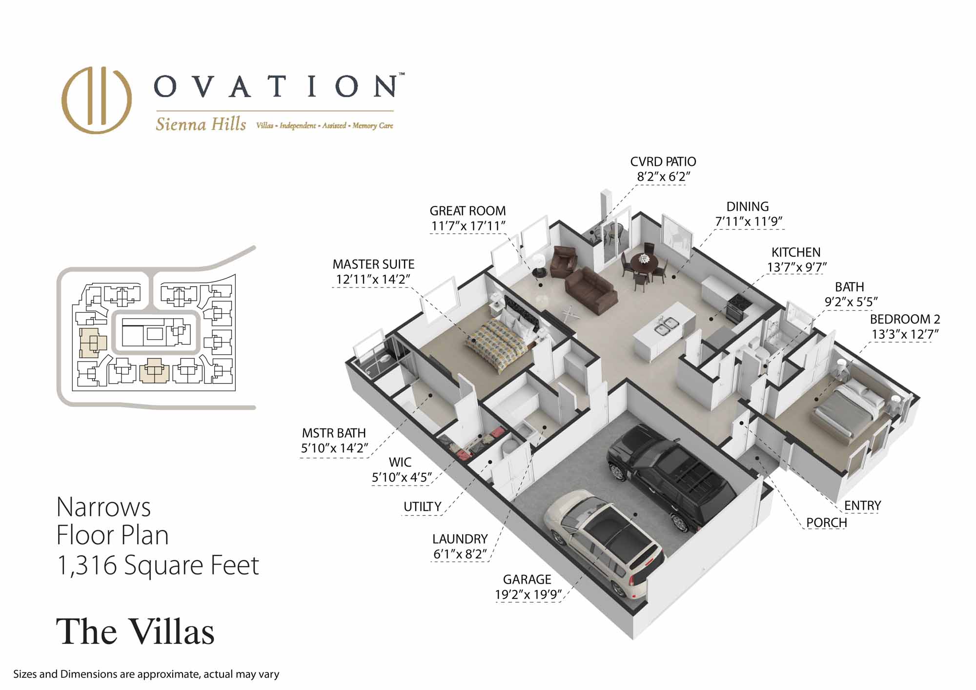 Bring your style to Ovation Sienna Hills. Select from six distinct floor plans from 1,280 to 1,316 square feet. All Villas feature a large garage with access to all Ovation Sienna Hill’s services and amenities.