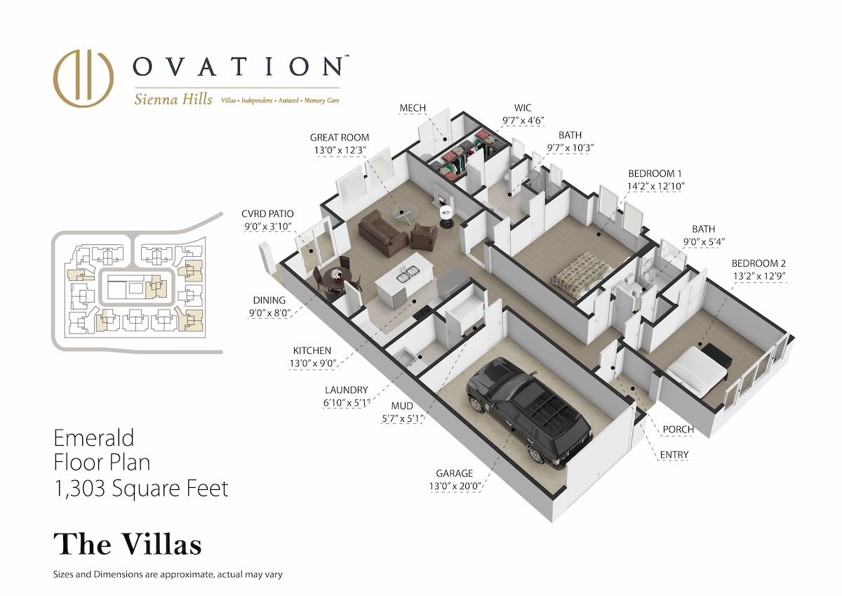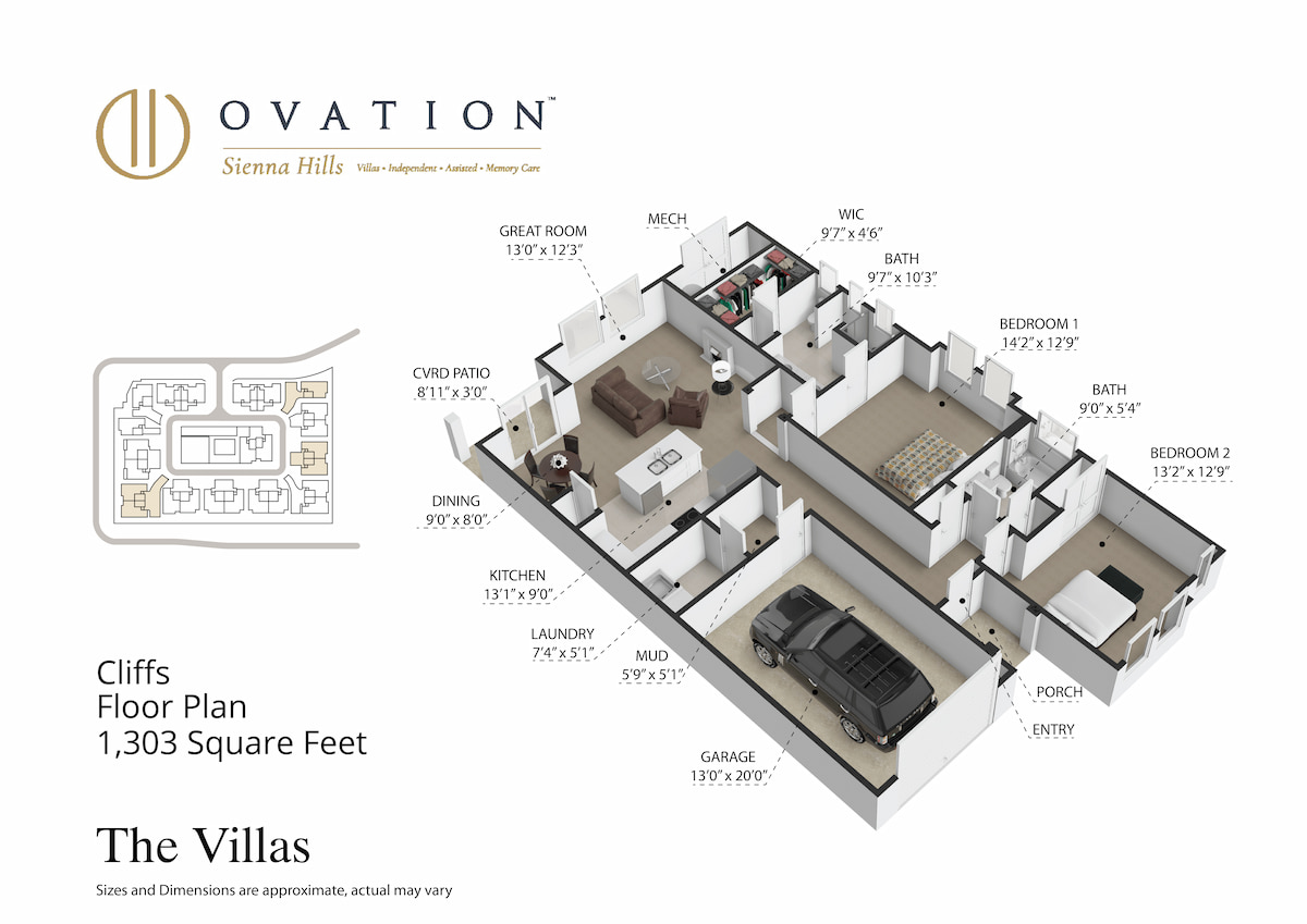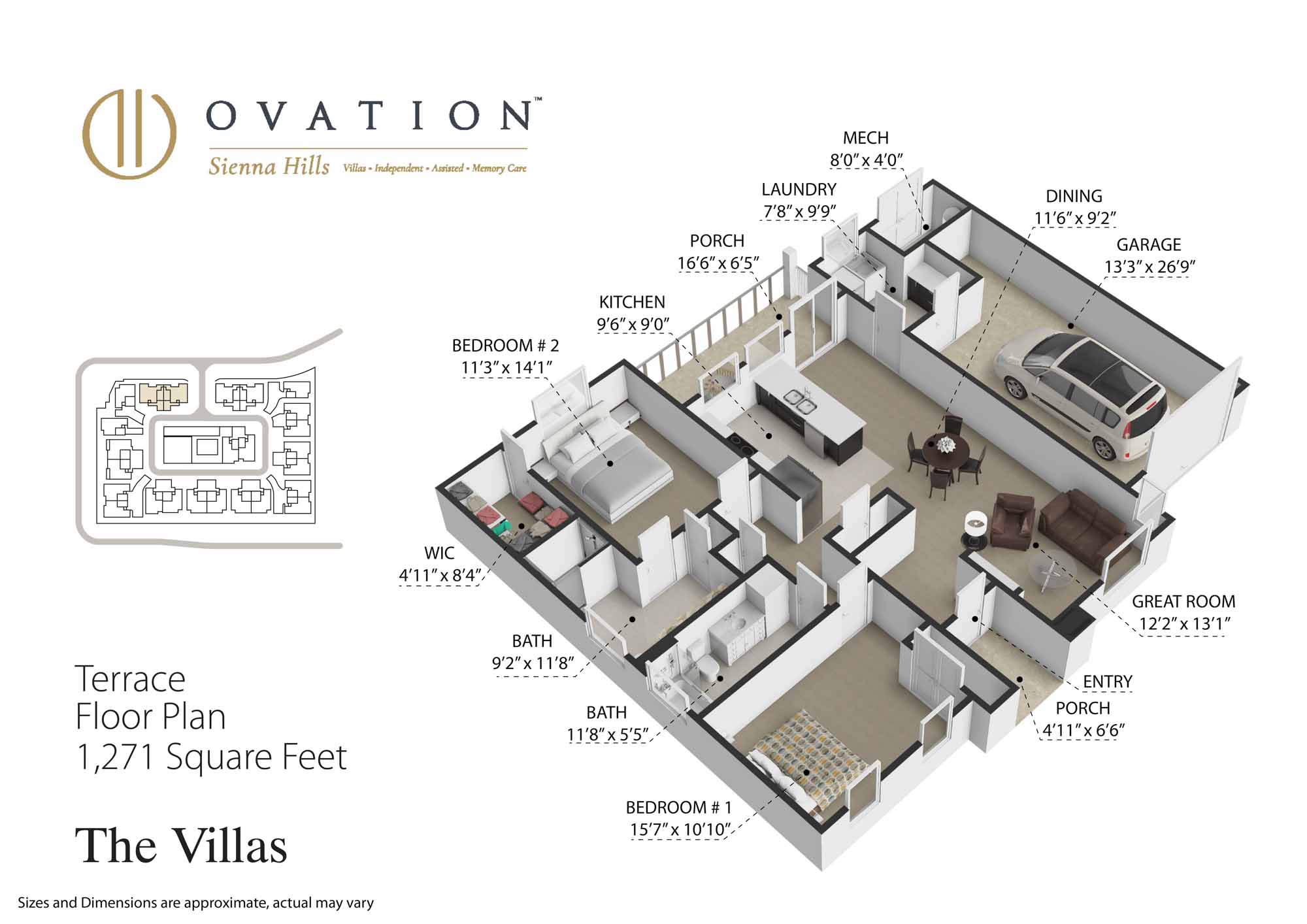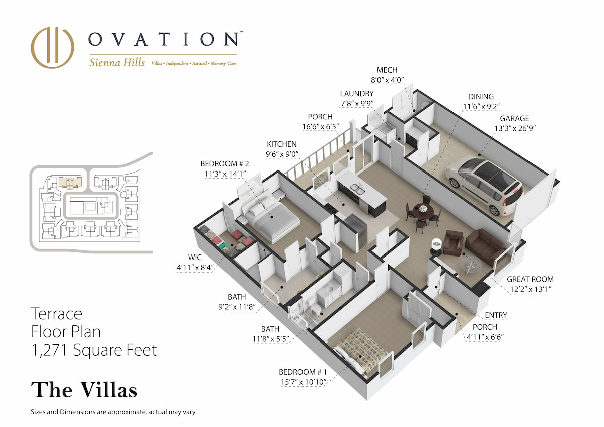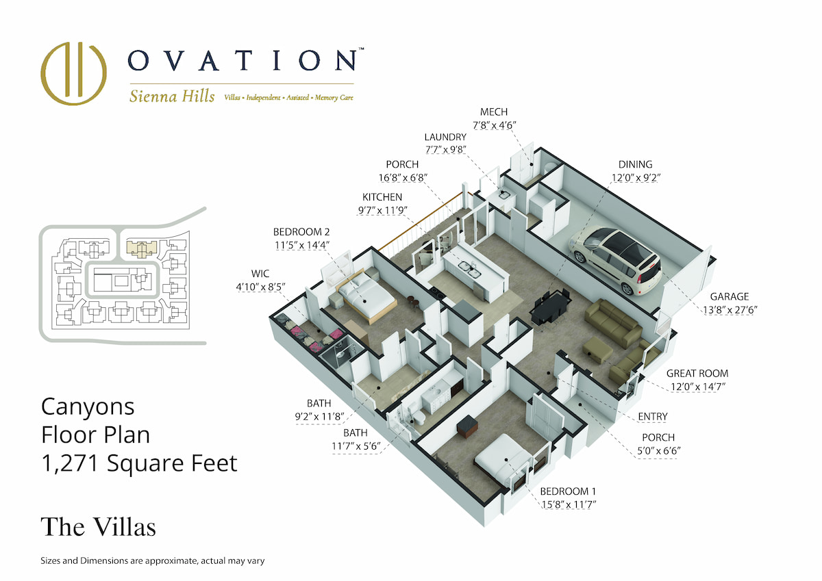 Bring your style to Ovation Sienna Hills. Select from six distinct floor plans from 1,280 to 1,316 square feet. All Villas feature a large garage with access to all Ovation Sienna Hill’s services and amenities.